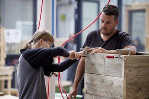 In de houtwerkplaats maak je veel dingen die van hout zijn. Dat doe je door te zagen, schuren, lakken, kloven en te demonteren.